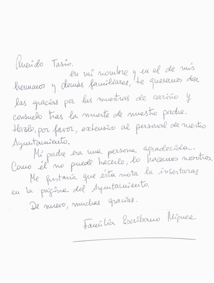 Carta de agradecimiento de la Familia Escribano Míguez al Alcalde